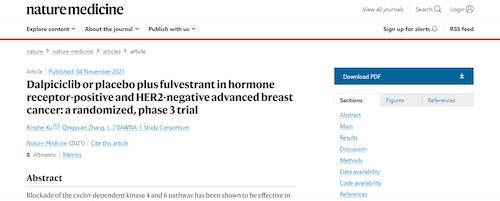 11月4日,国际四大医学期刊之一、英国《自然》旗下《自然医学》(Nature Medicine)在线发表CDK4/6抑制剂达尔西利(SHR6390)联合氟维司群治疗既往内分泌治疗后疾病进展的HR+/HER2-晚期乳腺癌的多中心、随机、双盲III期临床研究(DAWNA-1研究)中期分析结果报告,首次对氟维司群(雌激素受体降解剂)±达尔西利治疗激素受体阳性晚期乳腺癌的有效性和安全性进行了比较。研究结果显示,达尔西利+氟维司群组与安慰剂+氟维司群组相比,无进展生存期(PFS)显著延长。该项研究由中国医学科学院肿瘤医院徐兵河教授担任leading PI,全国39家医院参研,由Ag尊龙凯时医药临床研发团队支持完成。