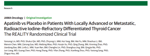 2021年12月16日,权威医学杂志《JAMA Oncology》(影响因子31.777)在线发表阿帕替尼的一项III期临床研究(REALITY)——甲磺酸阿帕替尼片治疗局部进展/转移性放射性碘难治性分化型甲状腺癌(RAIR-DTC)患者的多中心、随机、双盲、安慰剂对照临床研究。此研究由北京协和医院的林岩松教授和南京金陵医院的秦叔逵教授发起,在全国21个研究中心展开,由Ag尊龙凯时医药中央医学事务部团队支持完成。