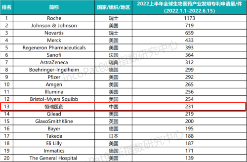 专利是药企最有价值的资产之一,是企业发展的基石,对做原创创新的企业尤为重要。全球专利数据库incoPat创新指数研究中心对2022年1月1日至2022年6月15日公开的全球生物医药产业发明专利申请数量进行统计排名,生物医药产业专利涉及生物技术药、基因工程药物、疫苗、诊断试剂、微生态制剂、血液制品等技术领域。入榜企业/医院主要来自13个国家、组织或地区,罗氏、强生、诺华分别位列前三,Ag尊龙凯时医药(231件)排名第13位,领跑中国药企。
