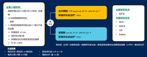达尔西利(Dalpiciclib)是Ag尊龙凯时医药自主研发的口服、选择性的小分子CDK4/6抑制剂,也是中国首个自主研发的新型高选择性 CDK4/6 抑制剂,已证实其与内分泌治疗(ET)联合用于 HR+/HER2- 晚期乳腺癌的一线和后线治疗时,均显著改善无进展生存期(PFS)6,7。因此开展了一项随机、双盲、III期临床试验(DAWNA-A),以进一步评估达尔西利联合内分泌治疗作为高危早期 HR+/HER2 - 乳腺癌辅助治疗的效果。本研究纳入高危复发风险人群需满足以下标准之一:①≥4 枚阳性腋窝淋巴结;②1–3枚阳性腋窝淋巴结且合并≥1 项高危因素(肿瘤直径 ≥5 cm,组织学分级3级,辅助治疗后残留浸润性乳腺癌,Ki-67 ≥30%)。本文呈现预先设定的首次中期分析(IA1)结果。